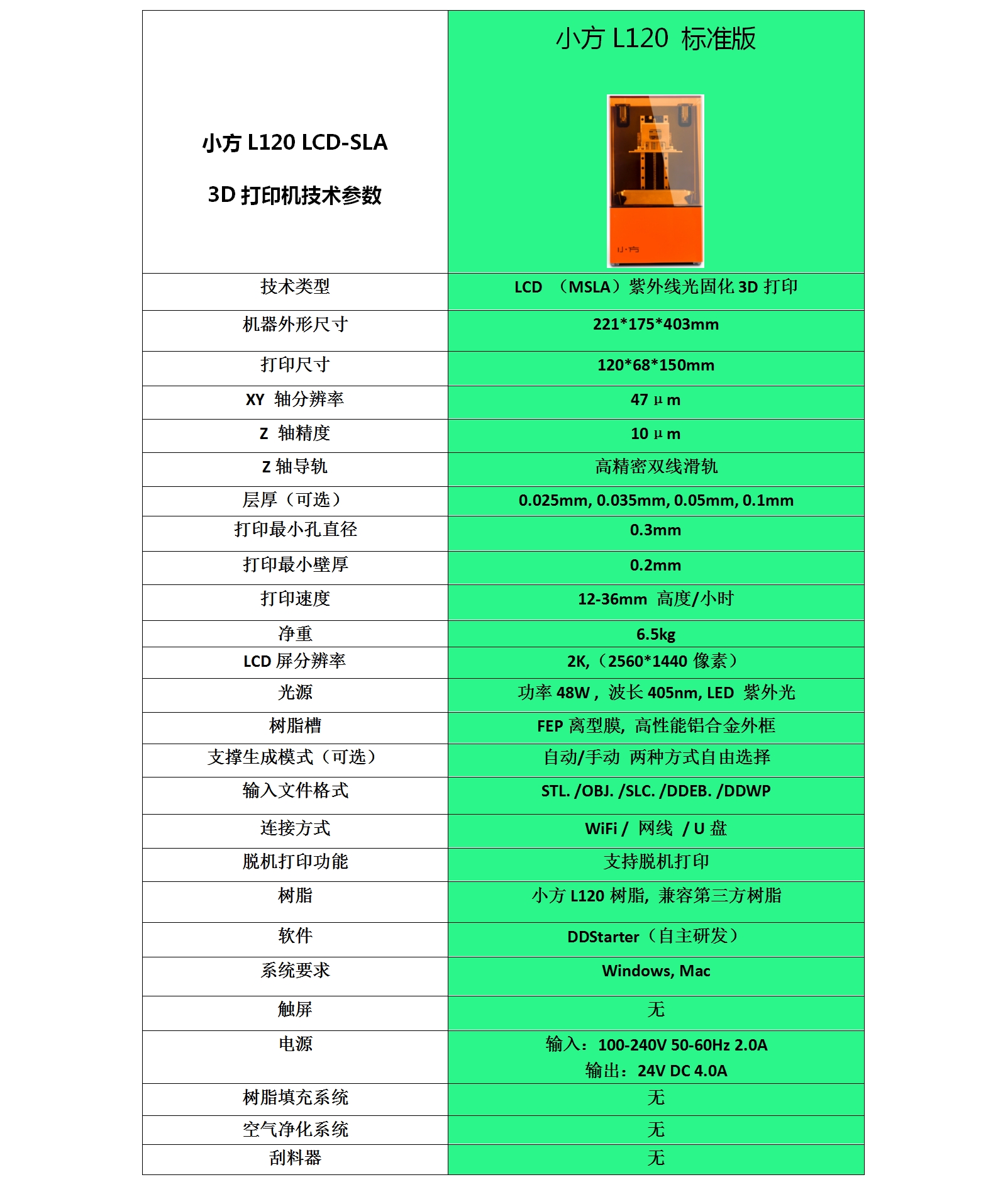 小方L120 3D打印機是一款利用光固化樹脂成型技術的桌面級3D打印機,采用的是“LCD選擇性區域透光原理”成型技術,設備外形時尚,機身內部采用了耐腐耐磨的航空鋁型材制作質感十足!同時配備了新一代夏普液晶顯示屏,分辨率高達2K級別,打印精度可達mm/層,支持無線連接打印,操作極其簡便快捷;該設備打印精度高、成型質量上佳、打印速度快、價格便宜,憑借出色的成型質量和打印細節廣泛應用于教育、齒科、工業設計、動漫文藝等對成型精度要求較高的行業領域。